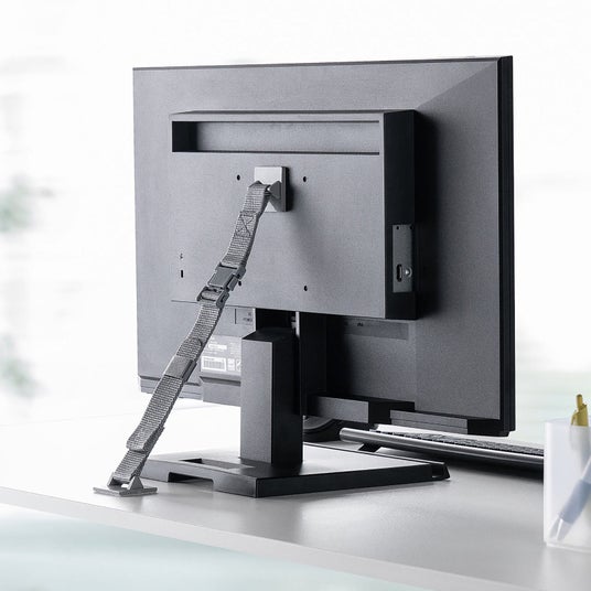 耐震試験済みで震度6強まで対応した転倒防止ベルト。地震によるモニターの転倒を防ぎ、ケガやモニターの破損を防ぐことが出来ます。