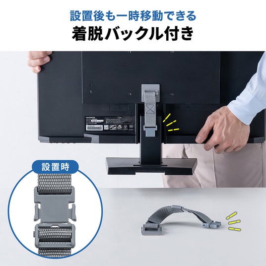 本体は粘着シールでの設置に対応。モニターと机に張り付けるだけで設置が行えるため、簡単に設置することが出来ます。また、着脱バックルが付いているため、設置後のモニター移動を行うことができます。