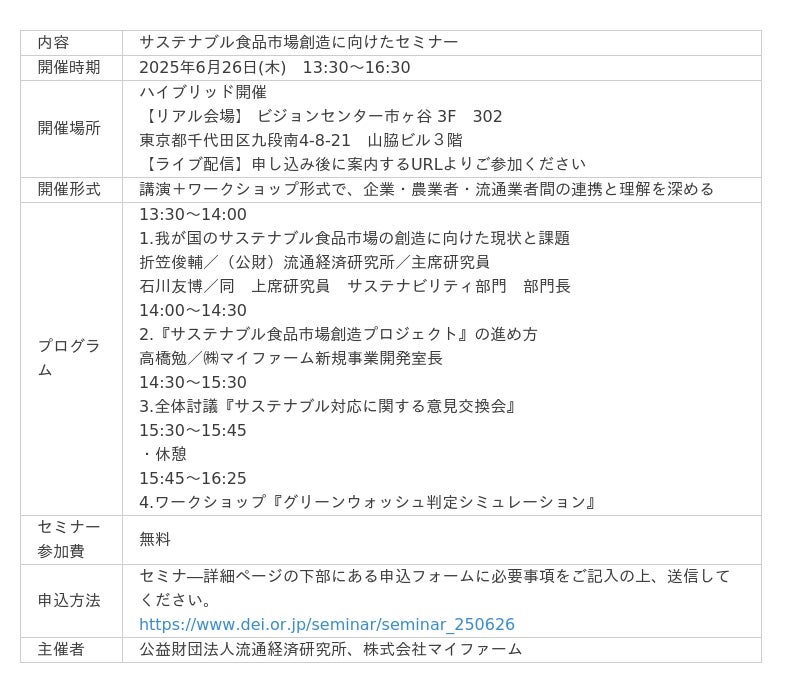 2025年6月26日(木) 13:30~ サステナブル食品市場創造に向けた無料セミナー開催。サステナブル食品市場づくりに取り組みたい企業・農業者・流通業者の参加を広く募集。