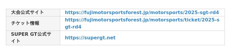 富士スピードウェイで8月2日(土)・3日(日)に開催する国内最大級のレースシリーズ「2025 AUTOBACS SUPER GT Round4 FUJI GT SPRINT RACE 夏休みスペシャル」では、現在販売している観戦チケットやパドックパスなどに加え、大人気の「ピットウォークパス」や「ファンシート」をはじめ、SUPER GT名物の「サーキットサファリ」、お部屋で観戦できる「Premier Lounge 4563」や「BRIDEプラチナペアルーム」、事前予約できるキャンプエリア「TGRコーナー/GR Supraコーナーキャンプパッケージ」、グランドスタンド等の各指定席や指定駐車場券を6月19日(木)午前10時から発売します。