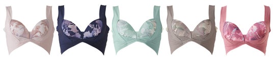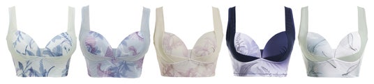 「リカバリーブラAir」左から、ブーケアイボリー/ブーケネイビー/ブーケセージ/ブーケトープ/ブーケモーブ
