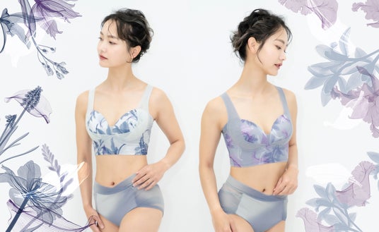 清涼感のあるブルー系の仕上がりを目指し、尚且つセットで着用できるショーツの色味に合わせデザイン制作を行いました。2つのブラで、同ショーツを着回しできるよう、両デザインに統一感を持たせつつ、選ぶ楽しさを担保できるよう差別化したデザインを作るため、微細な色味の調整とサンプル出力を繰り返し行い、試行錯誤のうえ、完成に至ることができました。