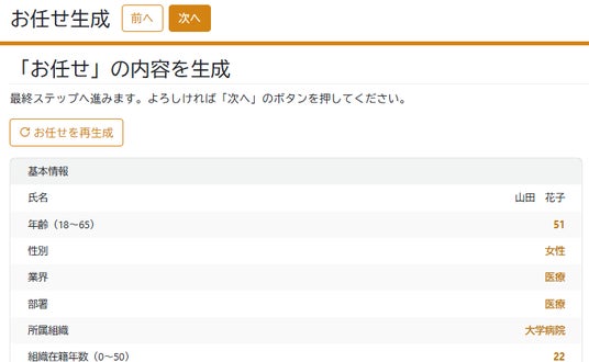 部下ペルソナは年齢、性格、経歴などを詳細に設定することが可能なため、自身の状況に合った1on1ミーティングをシミュレーションでき、本番の面談を効果的に進めることができます。