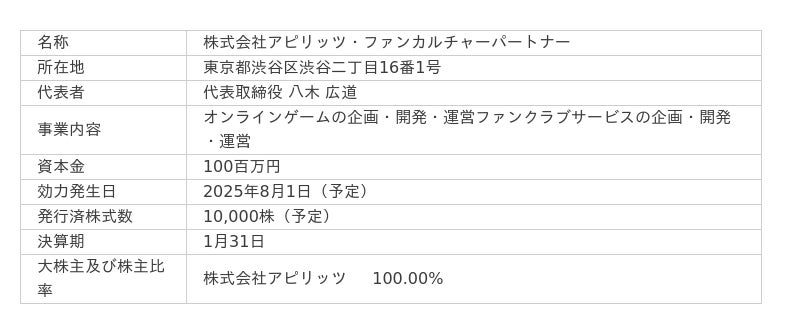 株式会社アピリッツ(本社:東京都渋谷区、代表取締役:和田順児、以下「当社」)は、本日開催の取締役会において、2025年8月1日を効力発生日(予定)として、当社の推しカルチャー&ゲーム事業(以下、「本事業」)に関する権利義務について、新設分割(以下、「本新設分割」)により、新たに設立する株式会社アピリッツ・ファンカルチャーパートナー(以下、「新設会社」)に承継させることを決議いたしましたので、下記のとおりお知らせいたします。