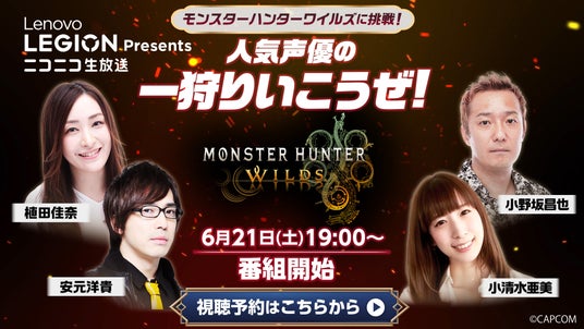 株式会社ドワンゴは、ライブ配信サービス「ニコニコ生放送」で6月21日(土)19時より、人気声優4名がゲーム『モンスターハンターワイルズ』を同時プレイするゲーム実況番組「モンスターハンターワイルズに挑戦!人気声優の一狩りいこうぜ! presented by Legion Lenovo」を生配信します。