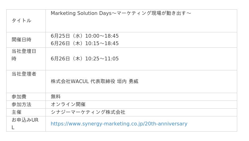 データと知見を核に、戦略から実行までマーケティングDXを一気通貫で支援する株式会社WACUL(本社:東京都千代田区、代表取締役社長:大淵 亮平、証券コード:4173、読み:ワカル、以下当社)は、シナジーマーケティング株式会社(本社:大阪市北区、代表:奥平 博史)が主催するオンラインカンファレンス【Marketing Solution Days~マーケティング現場が動き出す~】の基調講演に、WACUL代表の垣内が登壇することをお知らせします。