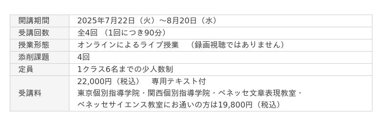 講習はすべてオンラインでのライブ授業。「文章の読み方」と「作文の書き方」を夏休みに集中して受講できます。