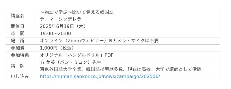 産経ヒューマンラーニング株式会社(本社:東京都新宿区、代表取締役:中谷友紀、以下「当社」)は、オンライン韓国語講座「~物語で学ぶ~聞いて覚える韓国語」を2025年6月19日(木)19時より開催いたします。