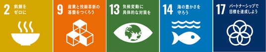今回の取組は、SDGsの17のゴールのうち、特に2番、9番、13番、14番、17番に貢献するものと考えております。