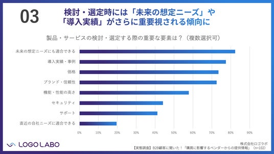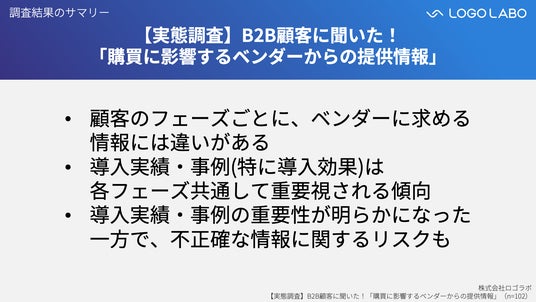 【B2B取引の実態調査】フェーズごとに顧客が求める情報は異なるが、実績・事例は一貫して65%以上が重要視。しかし不正確な情報で信頼を損なっているケースも(ロゴラボリサーチ)