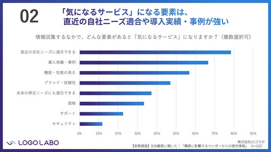 B2B事業者における実績の重要性がここでも示されました。逆に、特定業界の有力な実績・事例がある場合には同業企業への説得力が高まることも示唆されています。