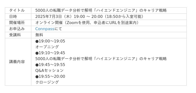 ハイエンドエンジニアに特化した審査制転職サービス『ASSIGN TECH』(https://www.tech.assign-app.jp/)を運用する株式会社アサイン(所在地:東京都千代田区 代表取締役:小瀬村 卓実)は、2025年7月3日にキャリア講義『5000人の転職データ分析で解明「ハイエンドエンジニア」のキャリア戦略』を開催いたします。本講義では、株式会社アサイン 執行役員CTO・須永高弘が登壇します。自らも現役エンジニアとして技術と経営の両面を歩んできた須永が、5000人分のキャリアデータと実体験をもとに、「どの様な経験やスキルが次のステージを切り拓くのか」を具体的に解説します。