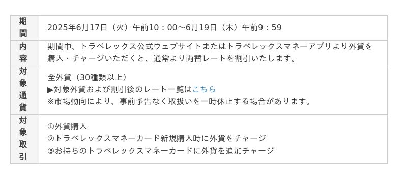トラベレックスジャパン株式会社(東京都港区 代表取締役 大谷淳)は、2025年6月17日(火)午前10:00から6月19日(木)午前9:59の期間、「48時間限定!オンライン外貨両替『トラベレックス・オンライン』レートセール」を実施いたします。本キャンペーンでは、全外貨を対象に通常よりレートを優遇いたします。