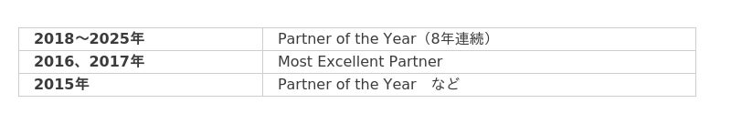 mcframe Awardは2003年に創設され、mcframeビジネスへの貢献がめざましいパートナー企業に対し、「Partner of the Year」、「Excellent Partner」などを授与しています。日立ソリューションズの受賞歴は以下のとおりです。