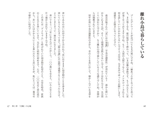 本著は佐藤愛子の最後の言葉と言っていいだろう。子どもの頃の、今はない昭和の初めの日本の風景、戦争の無力感、借金の苦労とそれを乗り越えた先の平穏……。祖母にとっては世界の片隅に記しておきたい最後の記憶たちである。これらの記憶を紡つむげる人間はもうかなり少なくなってしまった。百嫗の最後の言葉として、これらの言葉をここに残しておくことは、これからを生きる我々現代人にとっても価値のあることだと私は思っている。(「はじめに」に代えてより)