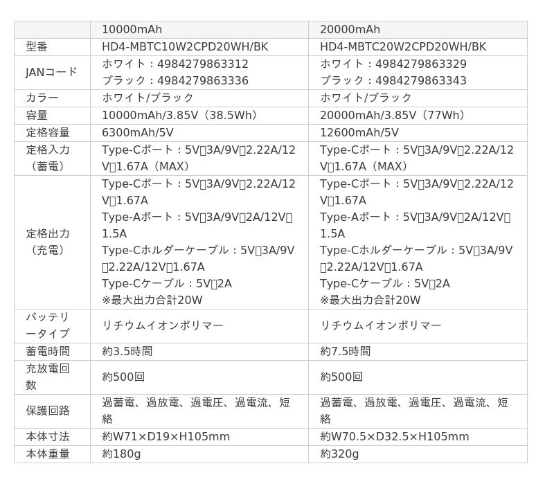 本製品は10000mAh/20000mAhいずれもPD20W出力に対応しており、急速充電が可能です。