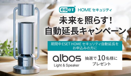 キヤノンマーケティングジャパン株式会社(代表取締役社長:足立正親、以下キヤノンMJ)は、個人向け総合セキュリティ対策ソフト「ESET HOME セキュリティ」の自動延長キャンペーンを2025年6月18日(水)より開始します。延長手続きの手間がかからず、有効期限切れを防げる自動延長サービスをお申し込みいただいた方の中から、抽選で10名にスポットライト型アルミスピーカー「albos Light & Speaker」をプレゼントします。