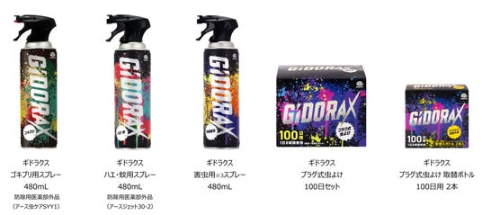 『GiDORAX(ギドラクス)』シリーズは、虫ケア用品を購入したお客様の声に着目し、効きめに徹底的にこだわった製品をラインアップしています。また、「どこでも映えるデザイン」をコンセプトに、効きめが直感的にイメージできるパッケージデザインに仕上げました。