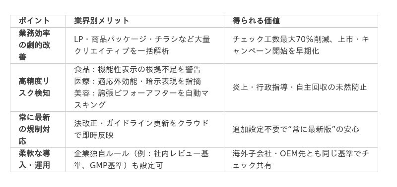 - 食品・医薬・美容など業界特化ガイドラインへの自動対応