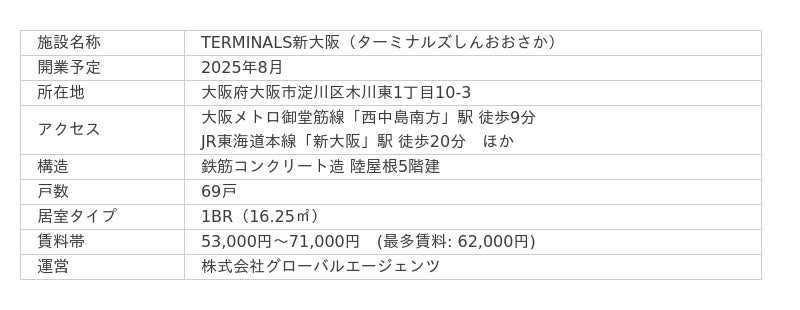 交流型賃貸住宅「ソーシャルアパートメント」を全国に展開する株式会社グローバルエージェンツ(本社:東京都渋谷区、代表取締役:山崎 剛)は、大阪市内で初となるソーシャルアパートメント「TERMINALS(ターミナルズ)新大阪」を2025年8月に開業いたします。また現在、公式WEBサイトにて入居者募集を開始しています。