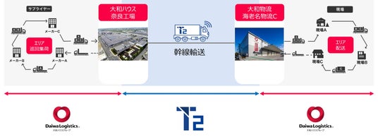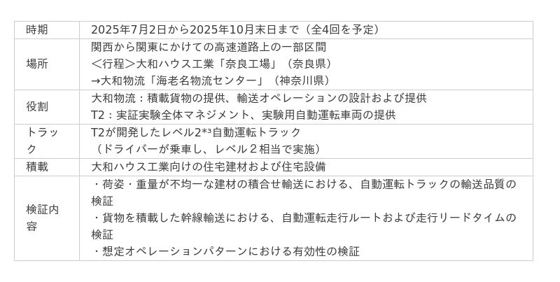 こうした状況を受けてT2は、物流危機への対応として自動運転トラックによる幹線輸送の実現を目指しており、大和物流はドライバー不足の代替手段としての可能性に着目し、2023年にT2へ出資しました。そしてこの度、大和物流とT2は、自動運転トラックによる住宅建材輸送において輸送品質の確保と安定的な輸送体制の構築を目的に、大和物流が大和ハウス工業に提供している調達物流*²の幹線輸送にて実証実験を実施することとしました。