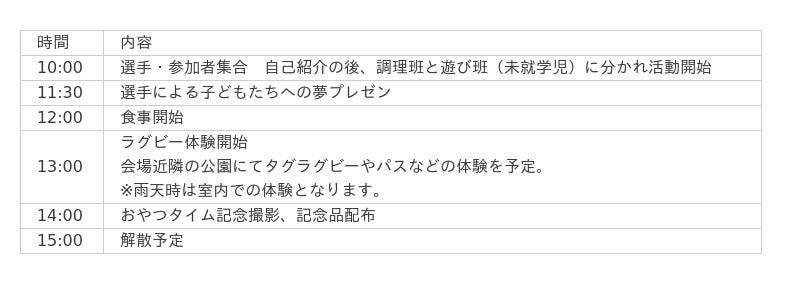 NPO法人「らいおんはーと」の活動理念に賛同いただいたスピアーズとの連携協定により実現するこのイベントは、江戸川区における社会課題の一つである貧困による教育格差や体験格差の解消を目的としています。普段なかなか触れ合うことのできない一流のラグビー選手との交流は、子どもたちにとってかけがえのない経験となるでしょう。調理活動を通じて食への感謝を学び、選手から直接、なぜラグビー選手になったのか、夢を追いかけることの素晴らしさを聞くことで、子どもたちの将来の夢へと繋がる大きなきっかけとなることを目指しています。【開催概要】