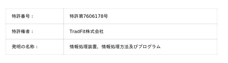 他にも多数の特許出願をしており、顧客バリューを基点に、強固な特許ポートフォリオを構築し、知財戦略でTradFitだけにしか提供できない独占領域を拡大し、事業の成長を最大化してまいります。