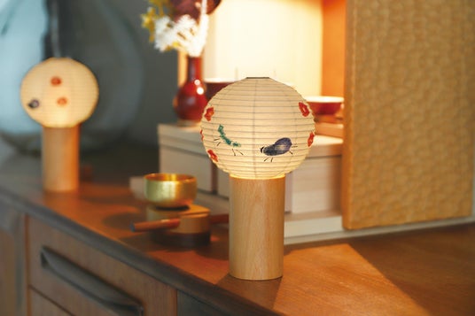 【盆提灯】tocco 精霊馬II 28,600円(税込) キュウリとナスが元気に駆け回る提灯絵が印象的な盆提灯。ブナ材の持ち手が北欧インテリアを思わせるおしゃれなデザインです。