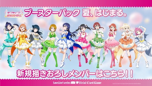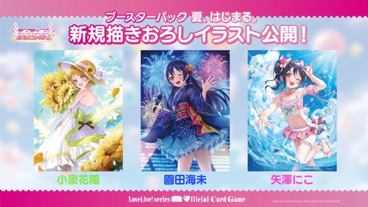 「ブースターパック 夏、はじまる。」には、μ’s から園田海未、小泉花陽、矢澤にこ、Aqoursから高海千歌、松浦果南、津島善子、虹ヶ咲学園スクールアイドル同好会からは上原歩夢、宮下 愛、エマ・ヴェルデ、天王寺璃奈の新規描きおろしイラストを使用したカードが収録されます。