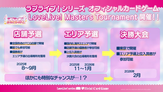 『LoveLive! Masters Tournament』は8月から全国各地のTCG店舗で店舗予選を行い、店舗予選で優勝したプレイヤーが11月より各地域で開催されるエリア予選への出場権璃を獲得できます。そして、エリア予選で上位入賞を果たしたプレイヤーが、来年2026年2月に東京で開催される決勝大会へと駒を進めます。