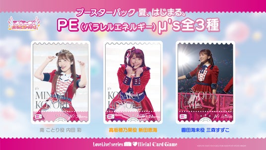 「ブースターパック 夏、はじまる。」にはμ’s 高坂穂乃果役 新田恵海、南 ことり役 内田彩、園田海未役 三森すずこの写真を使用したカードが収録されます。