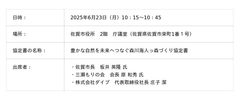 全国6カ所の地方地域でグランピング施設「ザランタン」をはじめとする宿泊施設を運営する株式会社ダイブ(東京都新宿区 代表取締役社長:庄子潔、証券コード151A)は、佐賀市および地域団体「三瀬もりの会」とともに、地域の自然資源の保全と活用を目的とした「豊かな自然を未来へつなぐ森川海人っ森づくり協定書」を締結します。