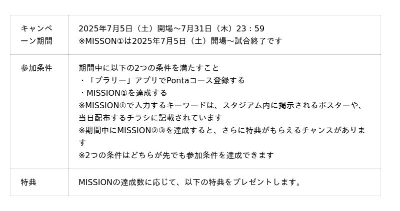 2年ぶり2度目のグランパスポンタによるキックインセレモニーを実施する他、初の試みとなる「グランパスポンタガチャ」が登場します。さらにPonta公認ポイ活アプリ「プラリー」でスタジアム内のスポットでチェックインした方に、もれなく観戦記念のNFTと50Pontaポイントをプレゼントするキャンペーンを開催します。計3カ所以上にチェックインした方には、抽選でグランパスポンタグッズや選手のサイン入りユニフォームなどをプレゼントします。