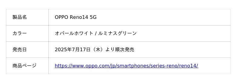 革新的なデザインとテクノロジーで業界をリードするスマートデバイスブランドOPPOは、待望のRenoシリーズ最新機種「OPPO Reno14 5G(オッポ リノフォーティーン ファイブジー)」を7月17日(木)より順次販売開始します。