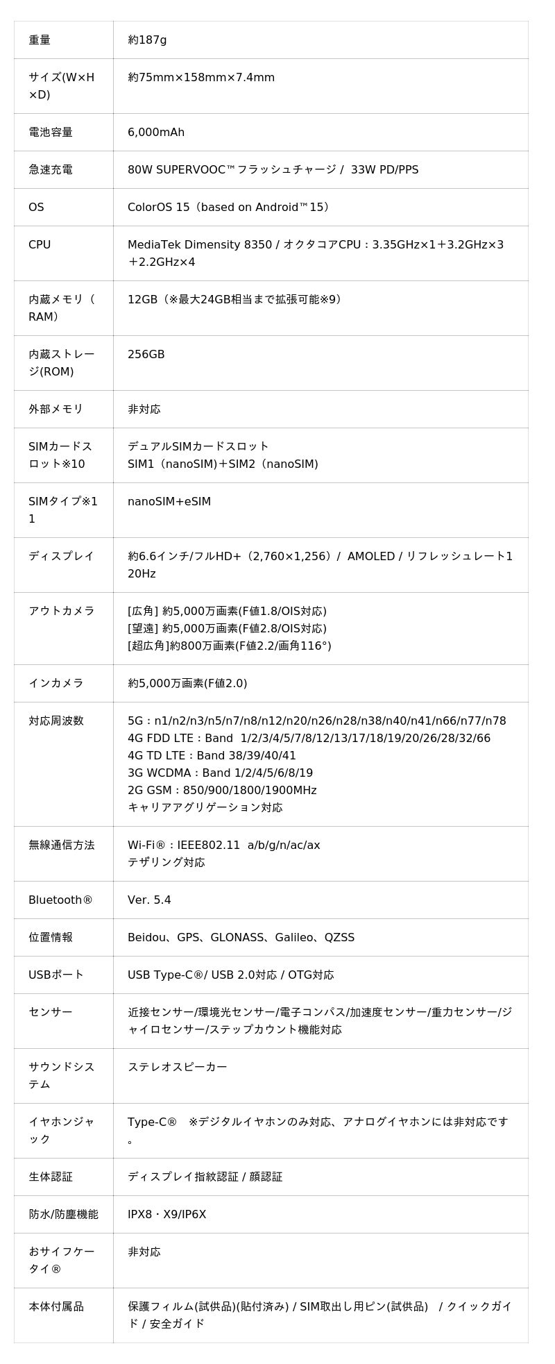 ■OPPO Reno14 5G製品の仕様・スペック