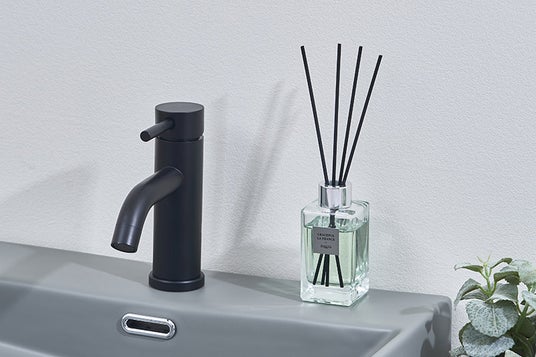 光を受けて輝く香水瓶のようなデザインが美しいリードディフューザー。