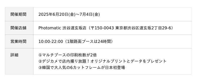 Photomatic 渋谷道玄坂店の2階のマルチブースのプリントが通常2枚印刷のところ、期間中は倍の4枚印刷でご提供いたします。ぜひ大人数で撮影をお楽しみください。