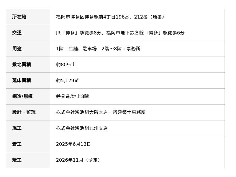 東京建物株式会社は、「T-PLUS博多駅前」(福岡県福岡市博多区、以下「本物件」)が2025年6月13日に着工しましたので、お知らせします。東京建物が展開する中規模オフィスビル「T-PLUS」シリーズとしては九州エリアにおける初の物件となります。また、東京建物による福岡市におけるオフィスビルの開発は、2009年竣工の「薬院ビジネスガーデン」「博多祇園センタープレイス」以来16年振りです。