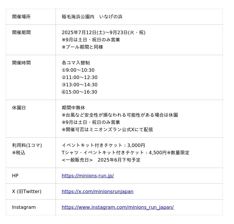 7月12日からは「いなげの浜」にてミニオンズランも開催決定!6月27日(金)10:00よりオンラインチケット販売開始!