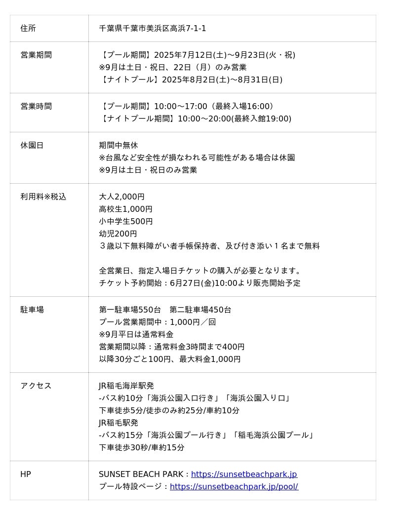 株式会社ワールドパーク(本社:千葉県千葉市、以下ワールドパーク) は、「SUNSET BEACH PARK INAGE*」内にて、2025年の稲毛海浜公園プール夏季営業の開始、ならびにミニオンズランの開催をお知らせいたします。