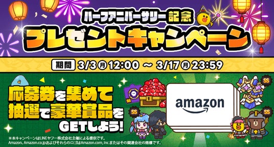 ハーフアニバーサリーを記念して、5万円分のAmazonギフトカードや28,000ルビー(召喚100回分)、SSキャラクター、SS装備などのゲーム内アイテムが当たる豪華プレゼントを開始します。期間中にゲーム内の対象ミッションをクリアするごとに獲得できる応募券で本キャンペーンに応募可能です。また、参加賞として参加者全員に300ルビーのプレゼントもあります。