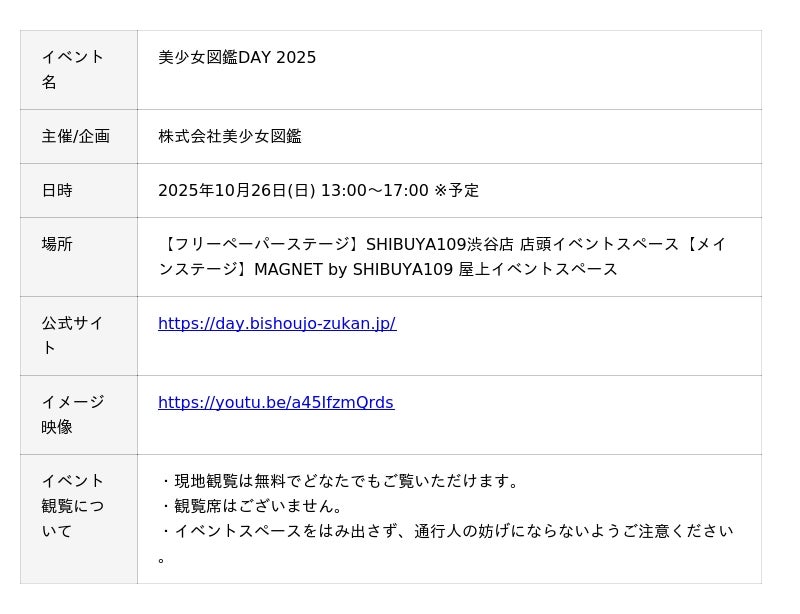 株式会社美少女図鑑(東京都渋谷区、代表取締役:中村孔亮)が運営する地域密着型メディア『美少女図鑑』は、全国各地の美少女図鑑モデルが集結する1DAYイベント「美少女図鑑DAY 2025」を2025年10月26日(日)にSHIBUYA109渋谷店 店頭イベントスペースならびにMAGNET by SHIBUYA109 屋上イベントスペースにて開催することを決定しました。