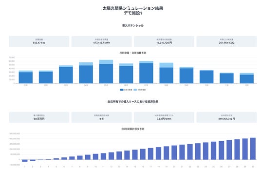 結果画面サンプル。屋根面積や電力使用量、電力契約等を考慮したシミュレーション結果を表示する。