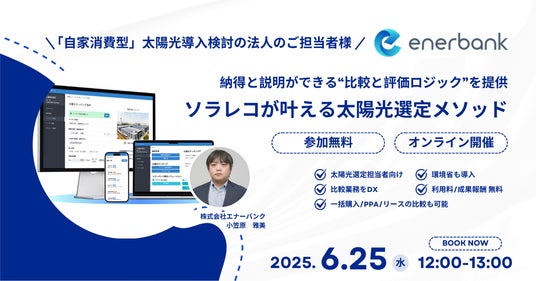 エナーバンクでは、2025年6月25日に、オンラインセミナー「ソラレコが叶える太陽光選定メソッド」を開催予定です。当社サービスであるソラレコの紹介を通じて、太陽光発電導入に向けた設置事業者の選定ポイントをお伝えします。このセミナーの中で、ソラレコ簡易診断のデモンストレーションも行いますので、太陽光発電の導入に関心のある法人様は是非ご参加ください。