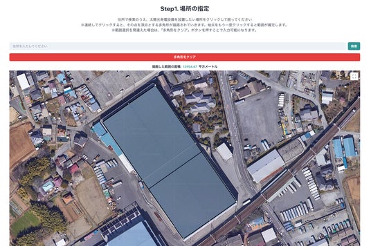 シミュレーション入力画面サンプル。地図上で屋根を囲うことで設置場所の面積や参照すべき日射データを指定できる。