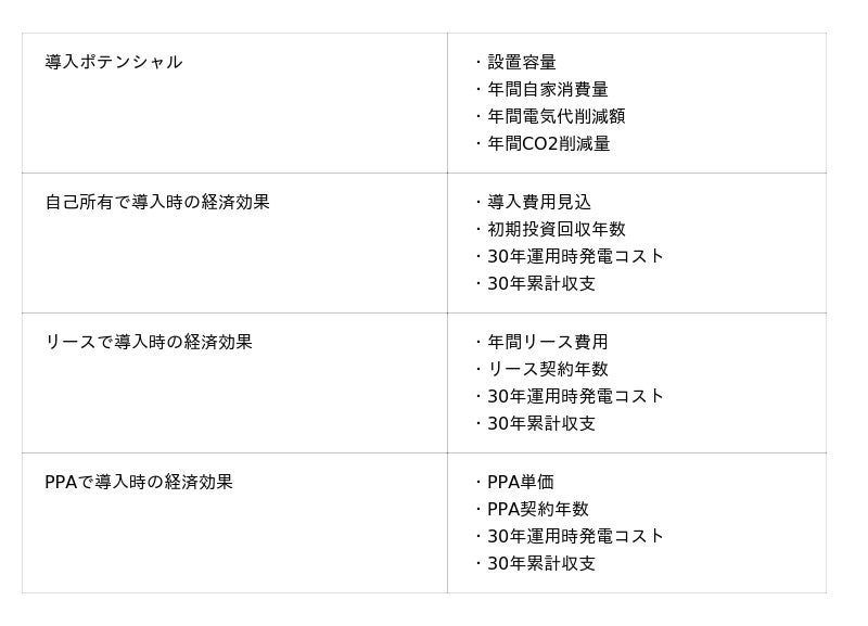 使い方はシンプルであるものの、実際の場所情報や電力契約、電力使用データを活用することで、高い精度でのシミュレーションが可能です。シミュレーション結果では以下の情報を提示します。