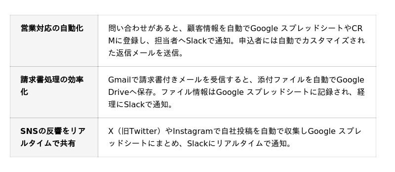 対応サービスはGmail、Slack、Google スプレッドシート、Notion、Salesforceなど多岐にわたり、定型業務の自動化、情報管理、通知フローの構築など、さまざまなビジネスシーンで活用できます。