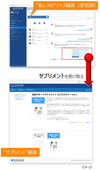 さらに、“気にかけ機能”のメッセージに連動した、成長のためのサプリメント(ショートコンテンツ)を受け取ることができ、成長のヒントからeラーニングへの誘導もできます。