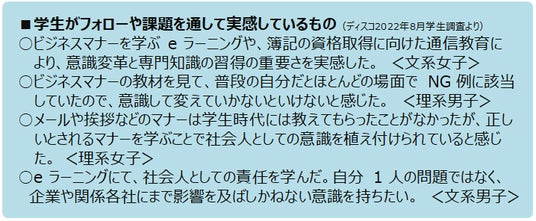 学生側も「ビジネスマナーやeラーニングなどの課題を通して社会人への意識変革が芽生える」という回答がディスコの調査で得られています。