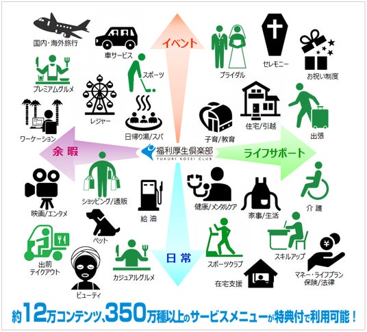 自己啓発、レジャー、ビジネスサポート、ライフプラン、スポーツ、飲食、家事・生活、ショッピング、健康、エンターテイメント、車サービス、育児・介護、住まい・引越 など